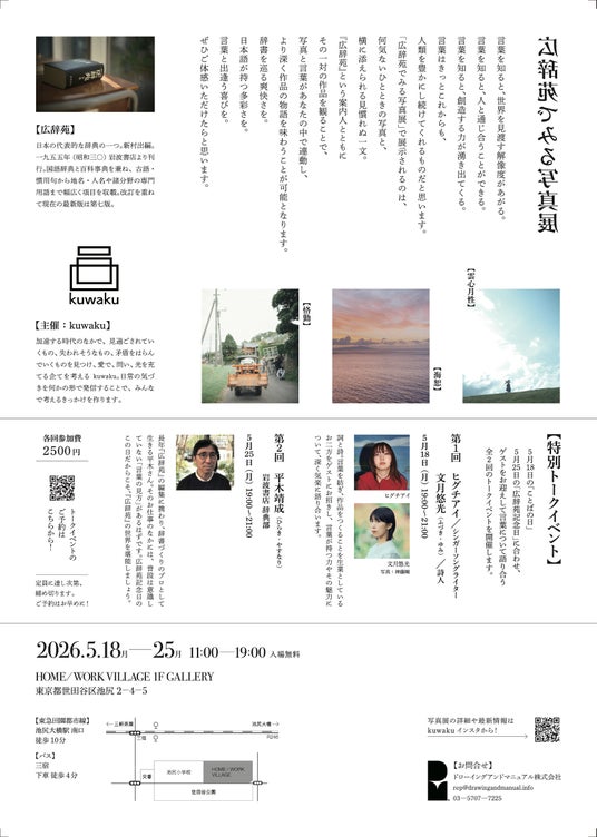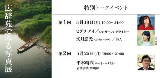 5月18日「ことばの日」、5月25日「広辞苑記念日」に合わせ、新たな写真展を開催。ヒグチアイ(シンガーソングライター)・文月悠光(詩人)・平木靖成(岩波書店)をゲストに、トークイベントも開催します。