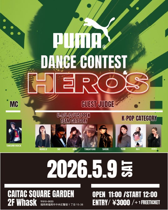 開催日:2026年5月9日(土)PUMAがサポートする本格ダンスコンテストが開催。U-9からオープンクラスまで、幅広い世代のトップダンサーが集結します。