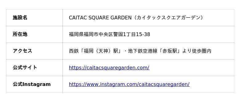 CAITAC SQUARE GARDENは、ファッション、グルメ、シネマ、スポーツなど多彩なテナントが集結するライフスタイル発信型商業施設です。「人・文化・体験がつながる場」をコンセプトに、訪れるたびに新しい発見がある空間を提供しています。GWから初夏にかけても、福岡の感性を刺激する多彩な企画をご用意しました。ここでしか味わえない体験を通して、日常を彩る新しいライフスタイルをぜひ見つけに来てください。