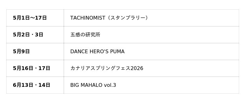 メインとなる5月16日(土)・17日(日)は、全館回遊型フェスティバル「カナリアスプリングフェス2026」を開催。GWの没入型イベントから、6月のハワイアンイベントまで、初夏のライフスタイルを彩るラインナップをお届けします。ファミリーから感度の高い大人、ペットオーナーまで幅広く楽しめる、全館回遊型のフェスティバルです。