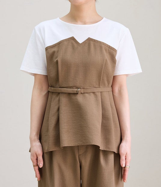 1枚でコーディネイトが決まる、ビスチェがドッキングされたトップス。ウエストタックの切り替えや、ウエストベルトのデザインにより、ボトムスインしなくてもバランスよく着こなせ、身体のラインをきれいに見せてくれます。