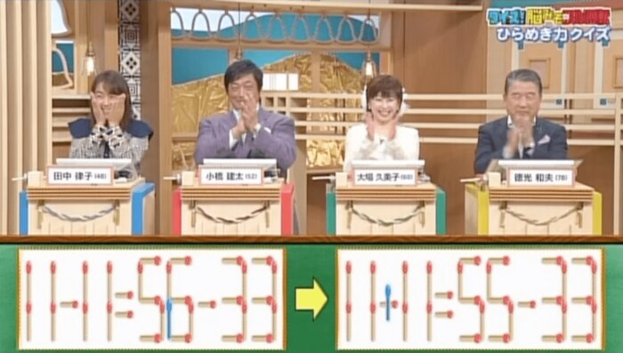 正解は、まず「6」から1本取り、左の式の「-」に足して「+」に。そうすると「11+11=55-33」となり、正しい式になりました。