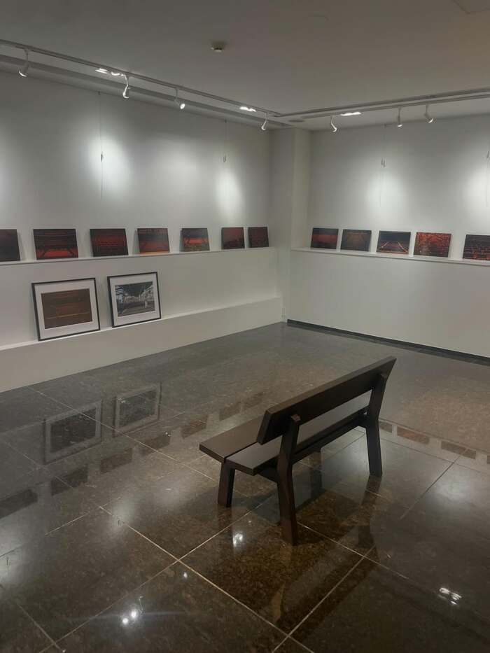 写真には、1つの木製ベンチを囲むよう、間接照明に照らされた いくつもの作品が並べられた空間がとらえられています。とても物静かで、吸い込まれそうな雰囲気です。