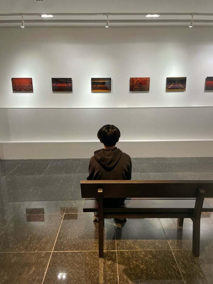黒色のパーカーを着てちょこんと座るその後ろ姿からは、静寂に包まれた空間で、作品から放たれる熱を懸命に受け止めているような様子がうかがえました。
