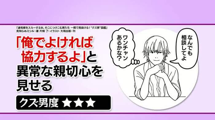 紹介されたのは、SNSで話題の見知らぬミシルさんによる著書「違和感をスルーする女、そこにつけこむ男たち 一瞬で見抜ける!“クズ男”図鑑」で紹介されている、クズ男の例です。