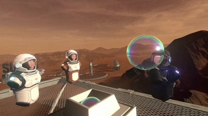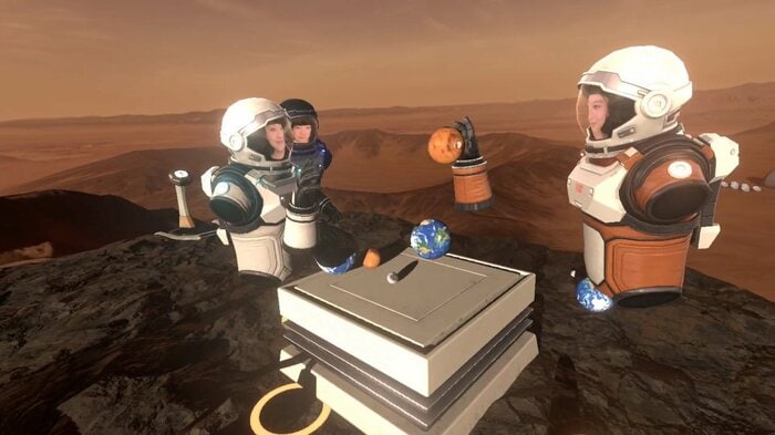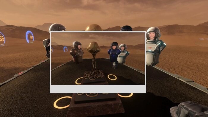 無事に火星に到着すると、そこは一面の赤褐色の世界。拍手して到着を喜び、火星人(?)のオブジェと並んでVRカメラで記念撮影をして楽しみます。