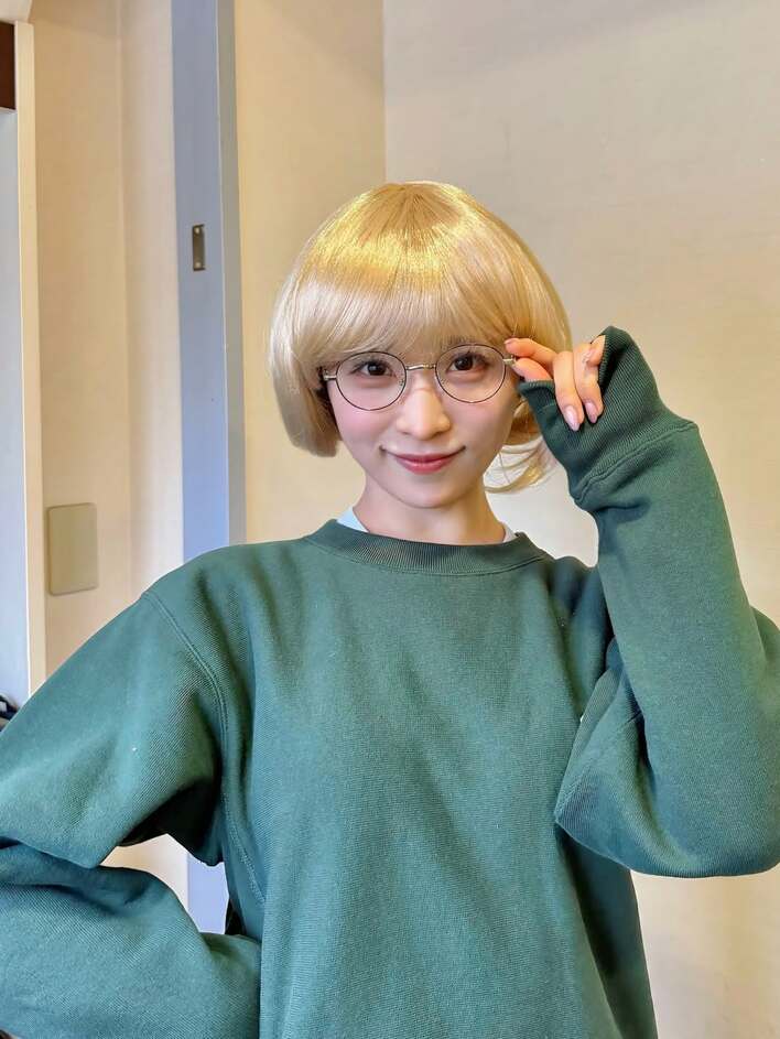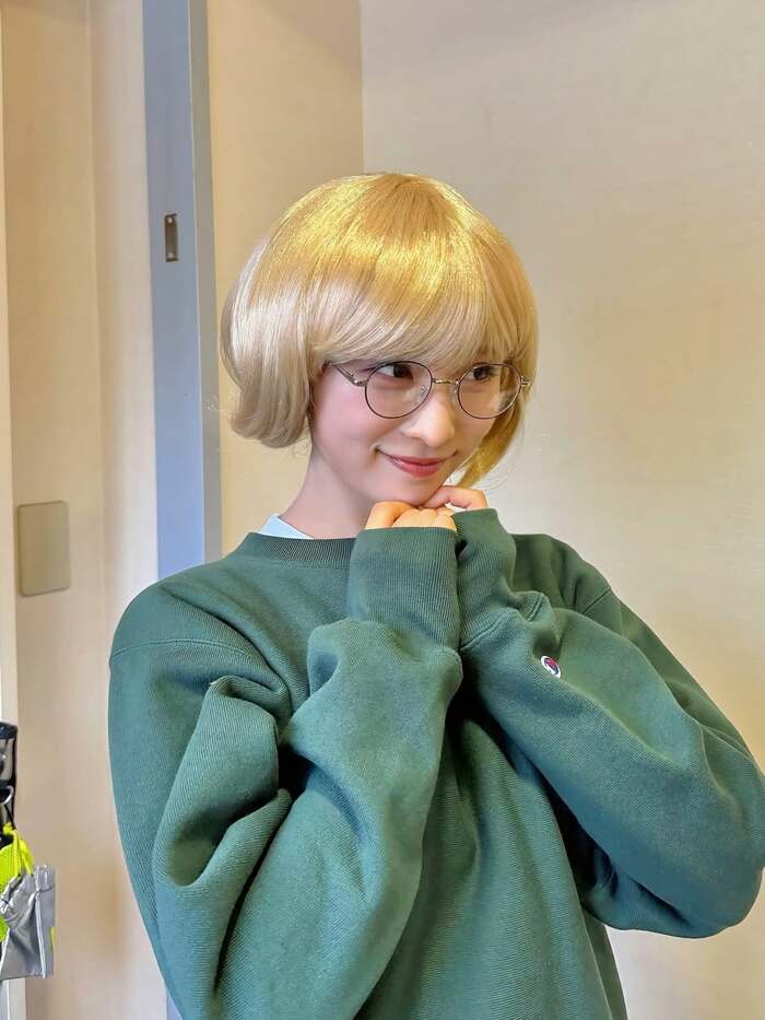 そこには、つやつやな金髪ボブヘアになった小栗さんの姿が!緑のトレーナーに身を包み、かけていた丸眼鏡に手を添えてにっこりほほ笑んでいて、雰囲気がガラリと変わっています。