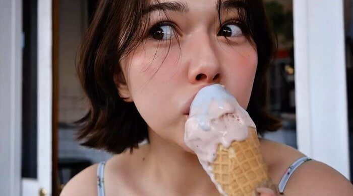 アイスクリームを片手に大きく目を見開いたキュートなショットを披露。