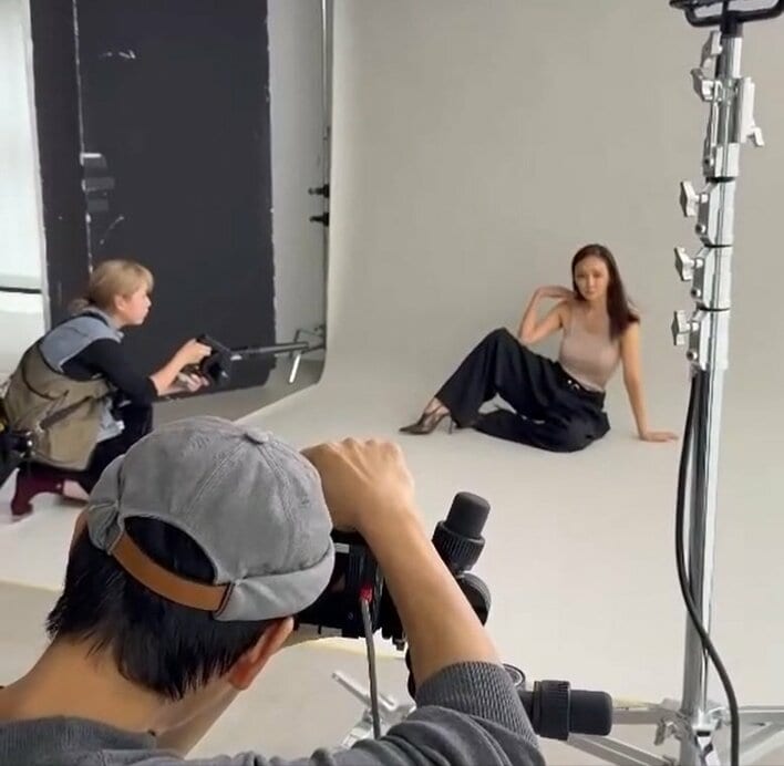 そこには、白い背景の前に片膝を立てて座り、カメラマンにポーズを決める神田さんの姿が。周りのスタッフからは、「すてき!」「きれいだなぁ…」「かっこいい!」など絶賛の声が次々と飛び交っています。