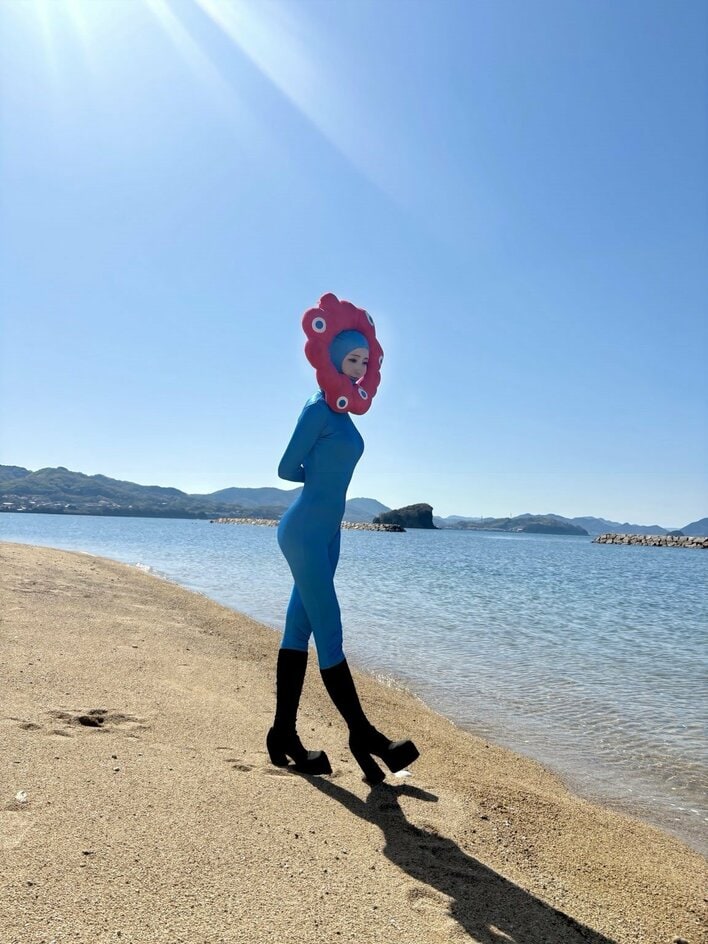 ピタッとした青色の全身タイツに身を包み、頭まですっぽりと覆うと、顔に赤色のワッカをはめてミャクミャクに変身。波打ち際にたたずみながら、ポージングまで再現しています!