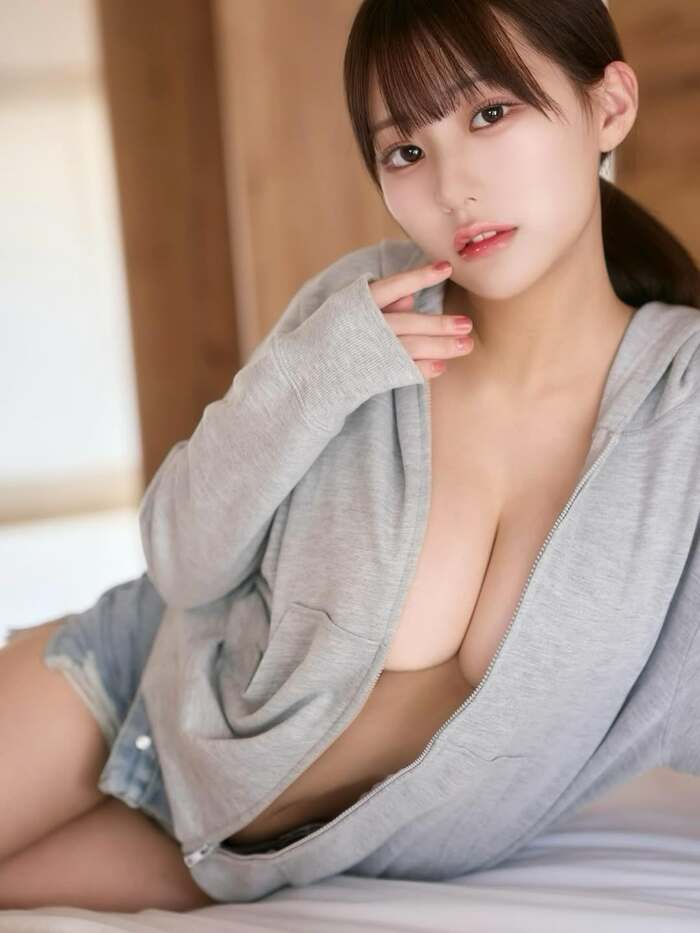 グレーのパーカーのファスナーを開けて胸元を大胆に披露しながら、ベッドに横たわる大人の魅力あふれるカットも。木のぬくもりのある空間に差し込む日の光も相まって、肌の透明感も際立っています。