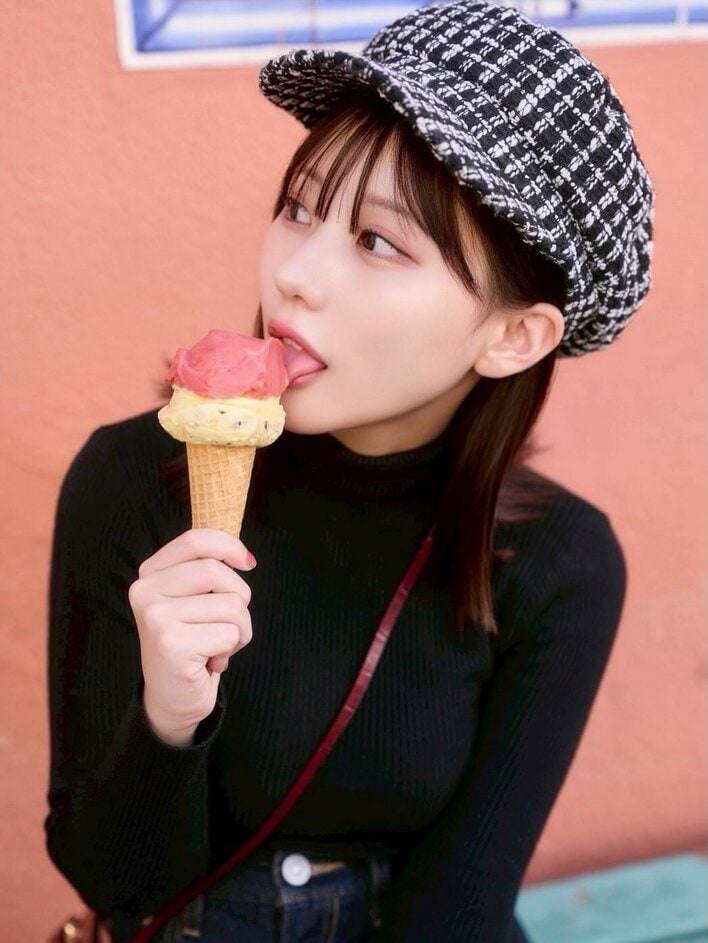 続いて、ギンガムチェック柄のキャスケットをかぶり、ピタッとした黒ニット×デニムコーデを披露。アイスクリームをペロッと食べる無邪気な1枚に。