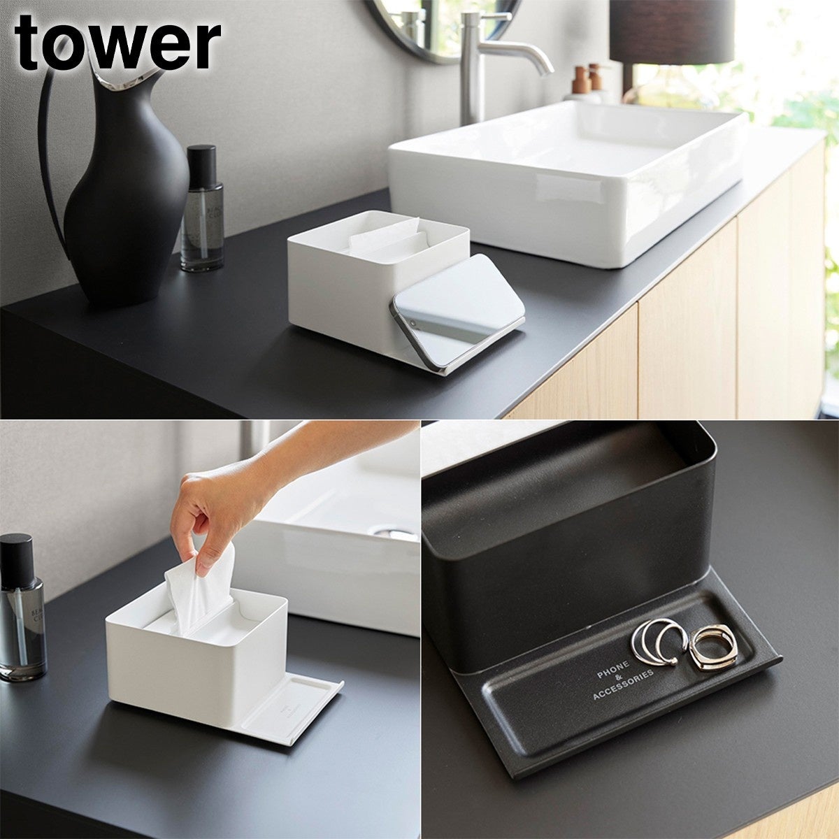 別売りのタワーシリーズと並べて配置すれば、洗面まわりをすっきり統一感のある空間に整えられます。