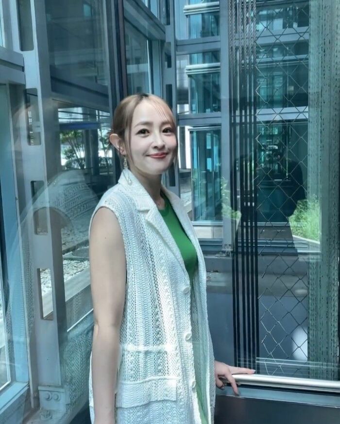 他にも、緑のトップスとスカートに白のベストを羽織ったファッションでエレベーターでポーズを決める姿などを公開した大沢さん。