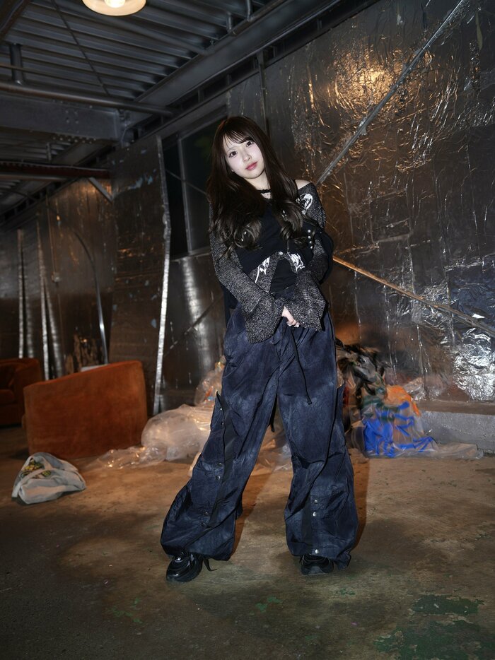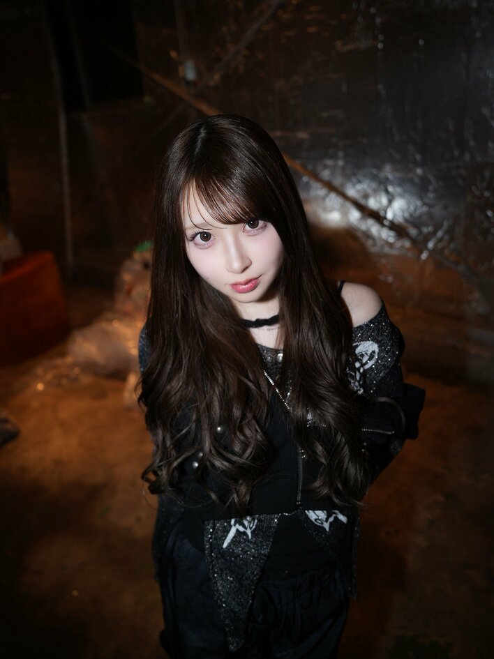 衣装には銀色のラメやチェーンがあしらわれており、薄暗い空間で光を反射。やや無表情な様子が、ミステリアスな魅力を引き立てています。