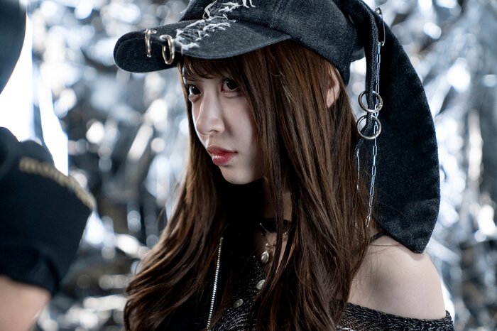 メタリックな背景が輝く中、カメラへ鋭い視線を向ける姿が印象的で、黒の帽子やチェーン装飾も相まって、クールな存在感を放つその姿は思わず息をのんでしまいます。