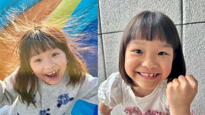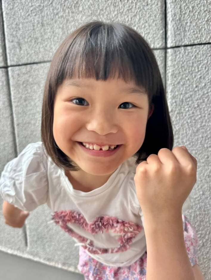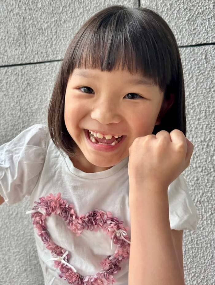 そして、ニューヘアスタイルに、まだ生え替わり途中の歯をにーっと見せながら、元気いっぱいな笑顔を見せる ののちゃん。
