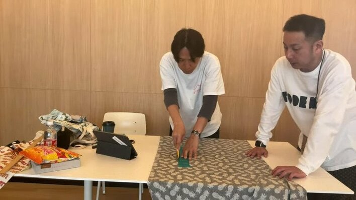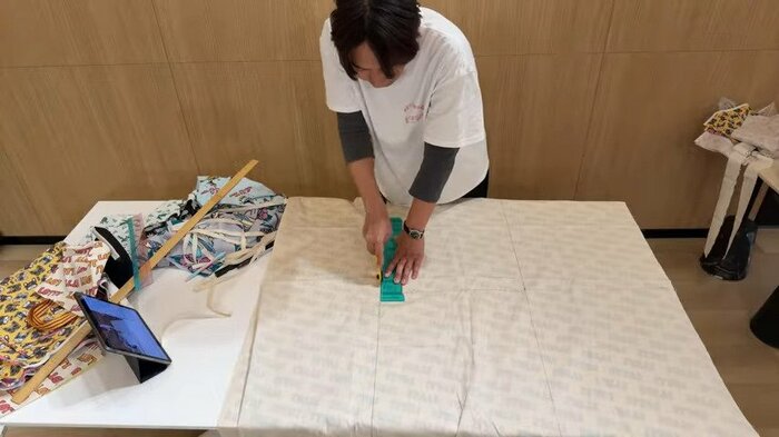 まずは、ハワイで購入したという大きな生地などをテーブルに広げて、印を付けていきます。