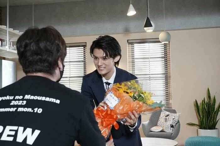 撮了を祝う拍手と花束を渡され、笑顔で写真撮影に応じた6人ですが…いつもと少し雰囲気が違う?特に印象が違うのは、犬飼翔を演じた藤原大祐さん。