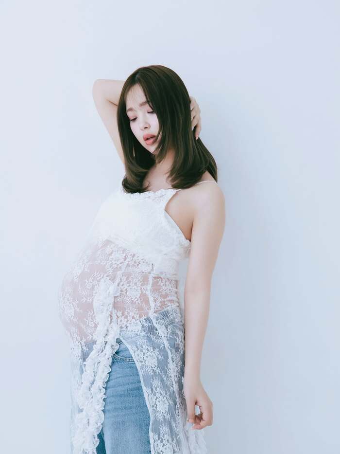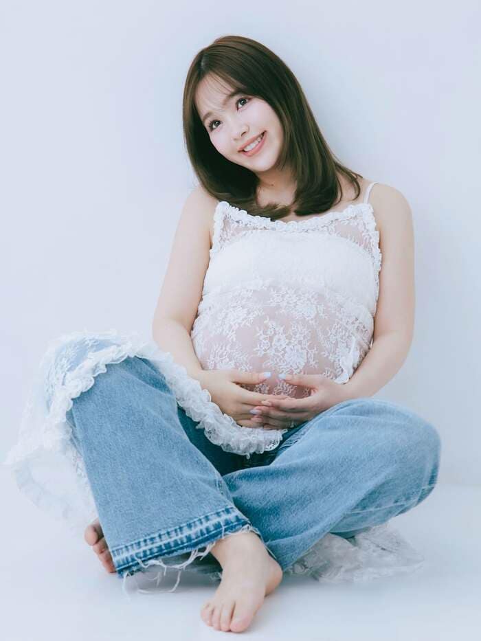 両手でおなかに手を添えて笑顔を浮かべるショットでは、柔らかな雰囲気がより一層増し、どこか神秘的にも感じられますね。