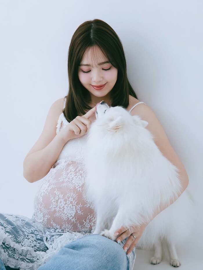今回の投稿では「1ヶ月前の私」とつづり、愛犬とのマタニティフォトを公開しています。