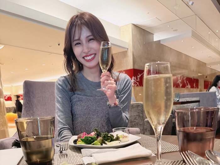 グレーで統一した落ちついたコーディネートで、シャンパングラスのようなものを手にする様子から、幸せなひとときを過ごしていることが伺えます。