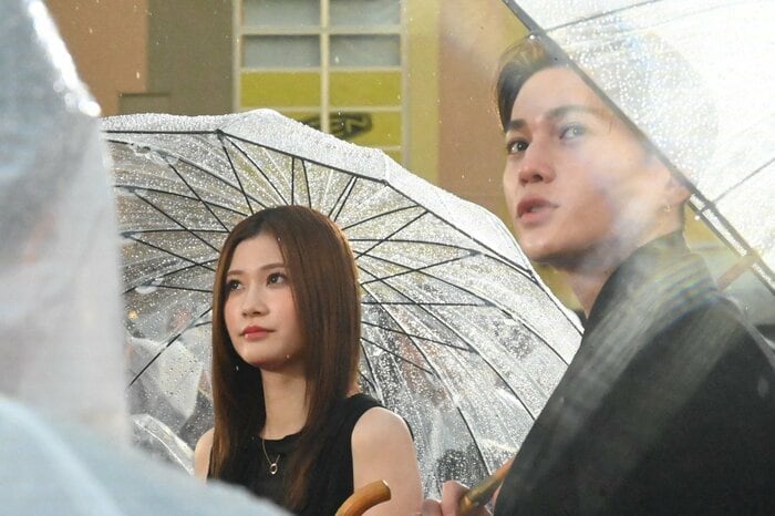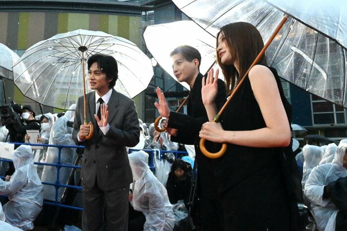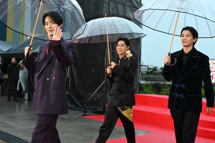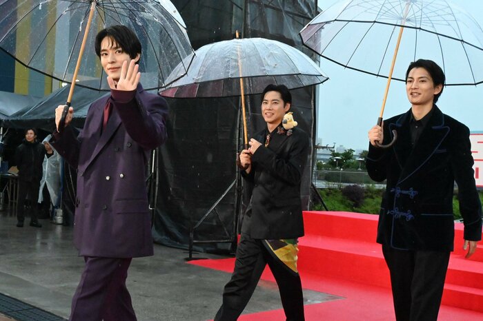 雨が降るなか夕方に行われたイベント。まず、目黒さん&高橋さん&横田さんが傘をさして登場すると、会場には「キャー!」という歓声が響きました。続いて塩野さん&渡邊さん&戸塚さん、そして八木さん&生見さん&北村さんも登場。集まった観客との交流を楽しみました。