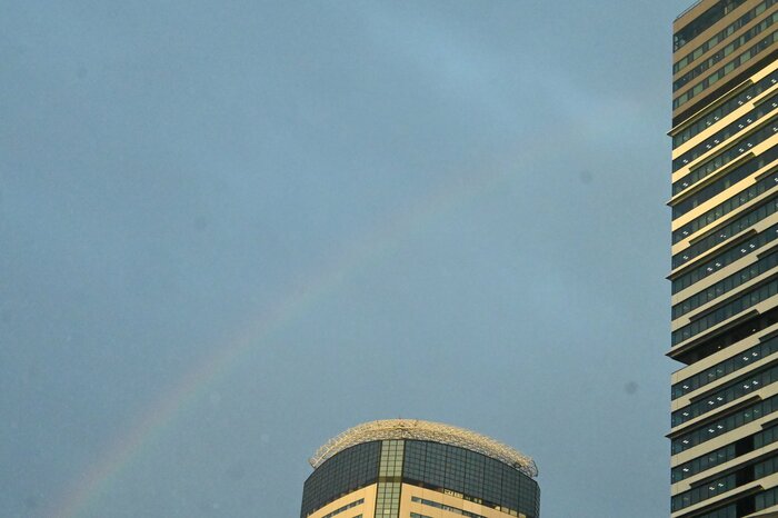 イベントが進むにつれ雨足が少し弱まり、西の空は薄いオレンジ色に染まり、東の空には虹が。まるで映画公開を祝うような空模様に、会場には「わぁー!」と歓声が広がりました。