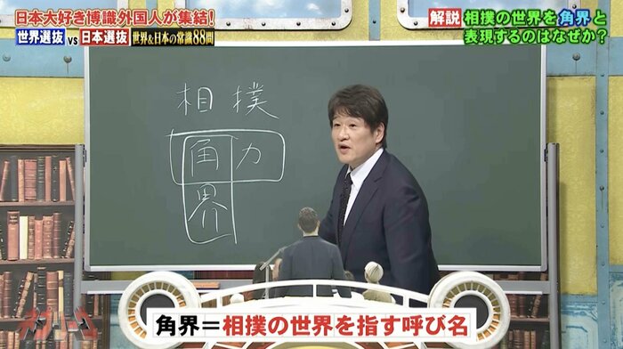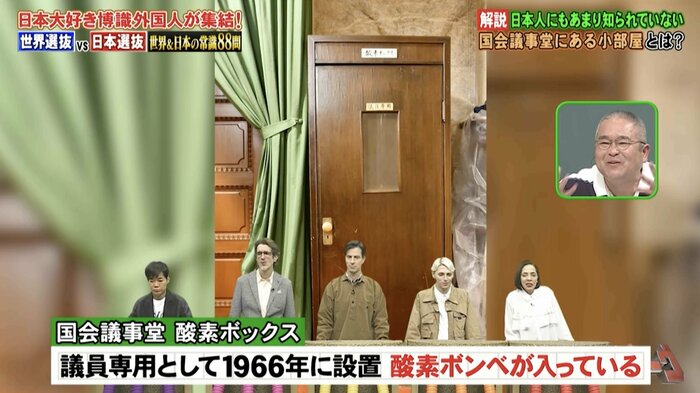 日本にまつわるモノの写真を見て名前を当てるクイズでは、問題に出題された「国会議事堂」にある小部屋について、地理担当の村瀬哲史先生が紹介しました。
