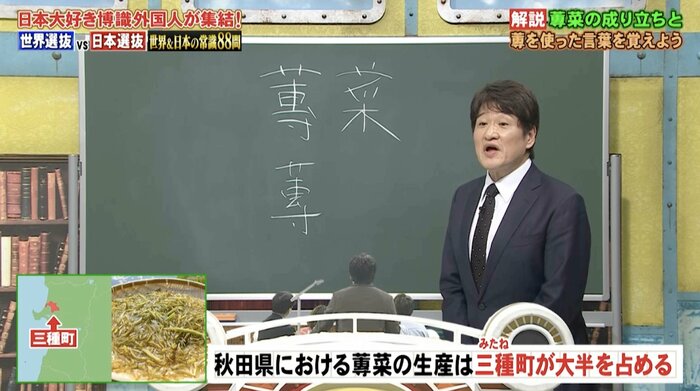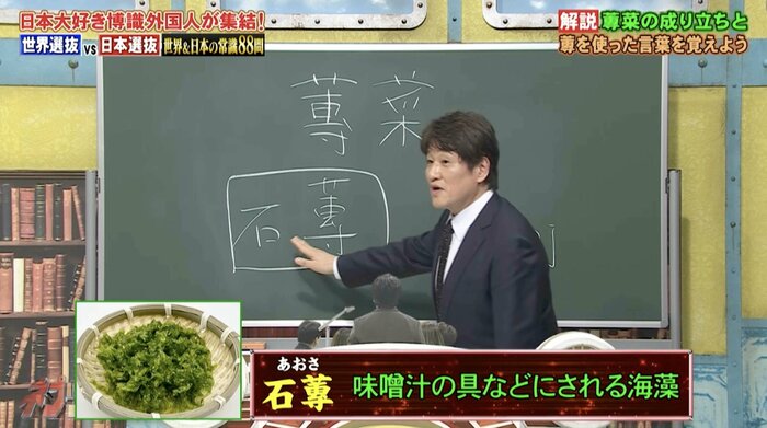 漢字を読み書きする問題では、出題された「蓴菜(ジュンサイ)」の「蓴」という漢字について林修先生が解説しました。
