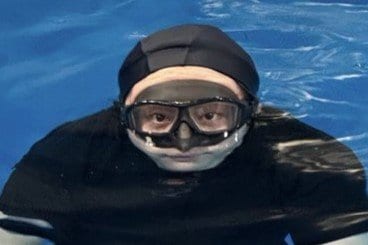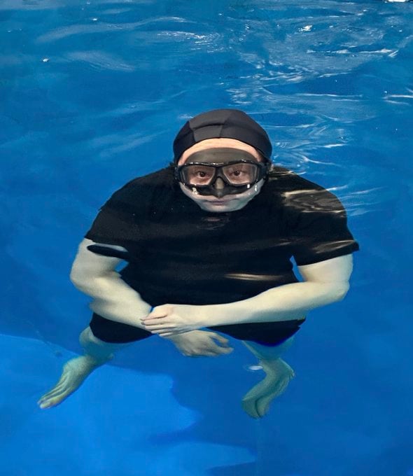 そこには、上下黒のスイムウェアを身にまとい、スイムキャップとゴーグルをつけて水の中に入りこちらを見つめる大森さんの姿が。その姿は思わず二度見してしまうほどどこかユニークです。