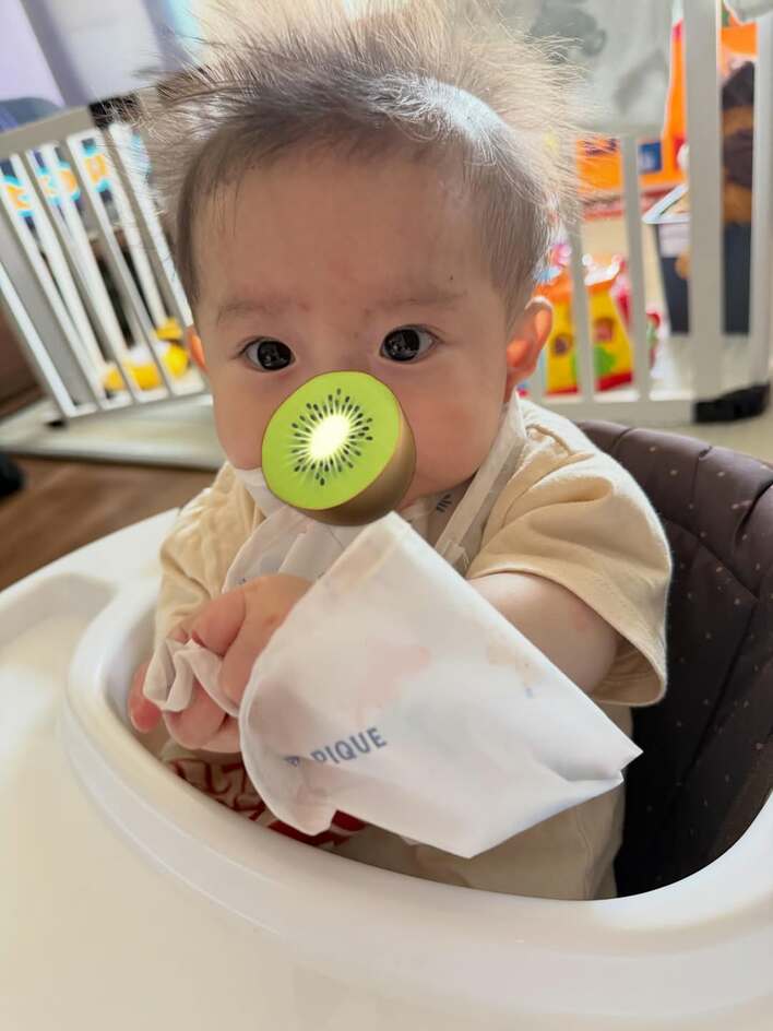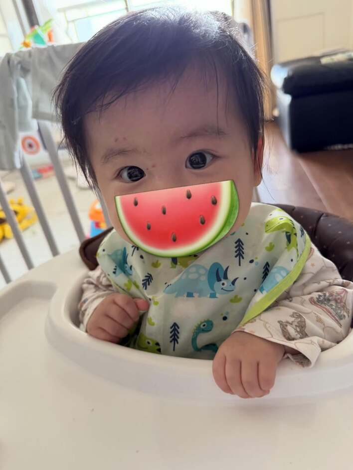 写真を見ると、恐竜の絵柄がちりばめられたスタイを着け、ベビーチェアに座るお兄ちゃんの姿が収められています。