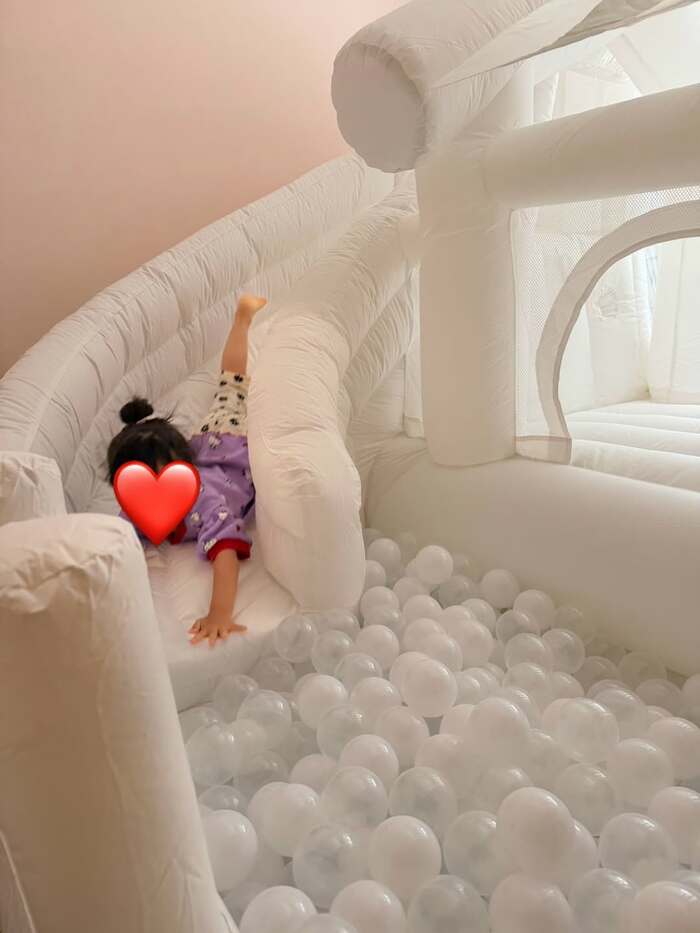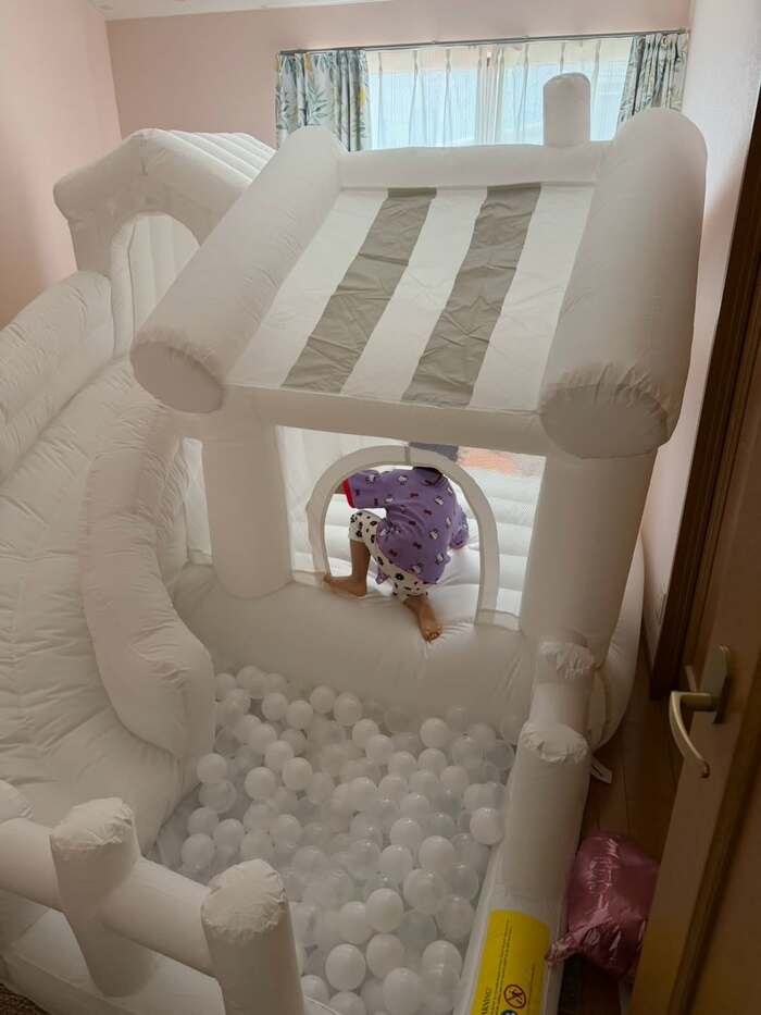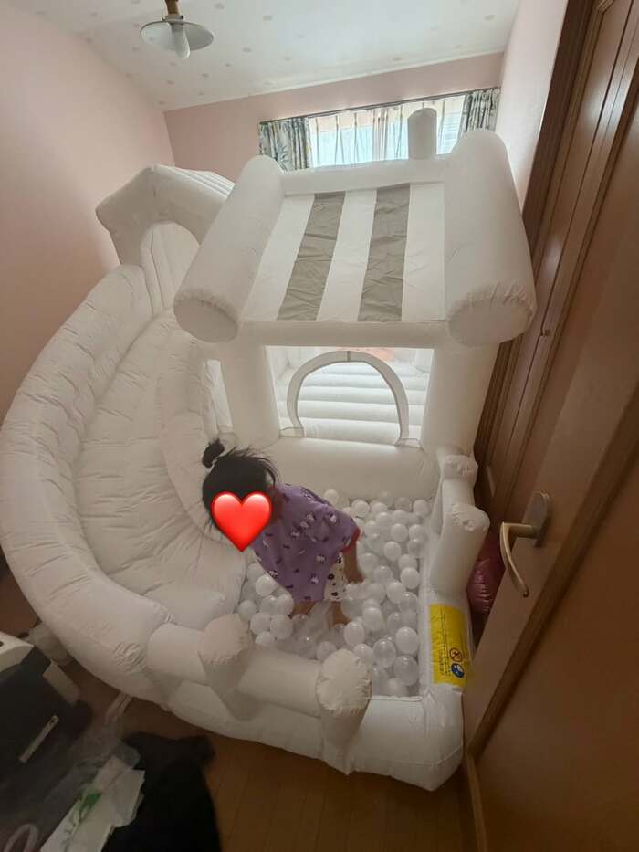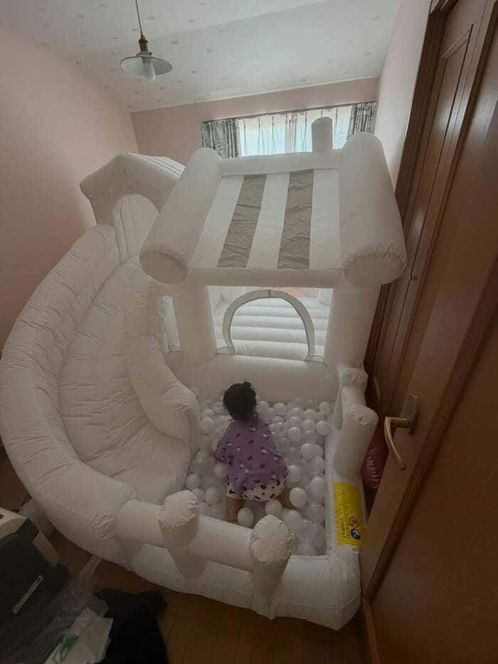 白を基調とした空気を入れて膨らませる仕様の大型遊具は、しっかりとした囲いと屋根付きの家がついた構造で、まるで小さなお城のようなフォームが印象的。