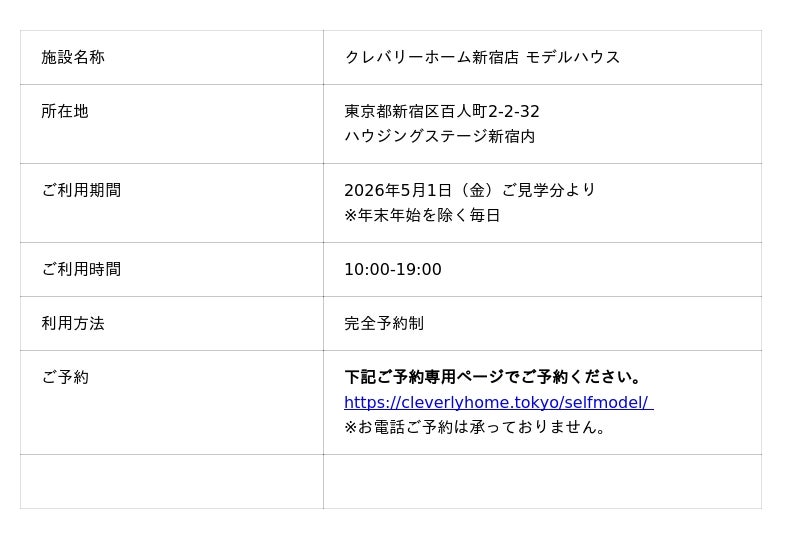 ou2株式会社(本社:東京都江東区、代表取締役:長張隆史)は、IoT活用により、お客様ご自身のスマートフォンでモデルハウスを解錠し、スタッフなしで自由にご見学いただける「セルフモデルハウス」のご提供を2026年5月1日(金)より「クレバリーホーム新宿モデルハウス」にて開始いたします。これにともない、専用予約サイトで受付を開始いたしました。