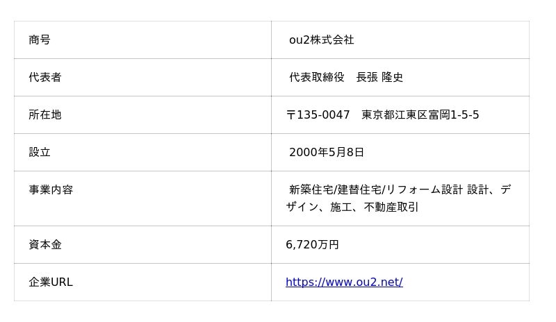 ou2(オーツー)株式会社は、主に東京23区近郊・沖縄県本土を中心に総合住宅サービス事業を展開しています。クレバリーホーム東京(城東店・新宿店)・沖縄(那覇店・泡瀬店)をはじめ、都内に多い制約ある土地にも対応する木造4階建ての「もくよん(R)」を提供するOU2HAUS(オーツーハウス)鉄骨・RC造注文住宅のM-LINE、リフォームのアールツーホーム / アールツーリノベーション、不動産・リノベーションのD-LINE を運営する総合住宅サービスを提供しています。