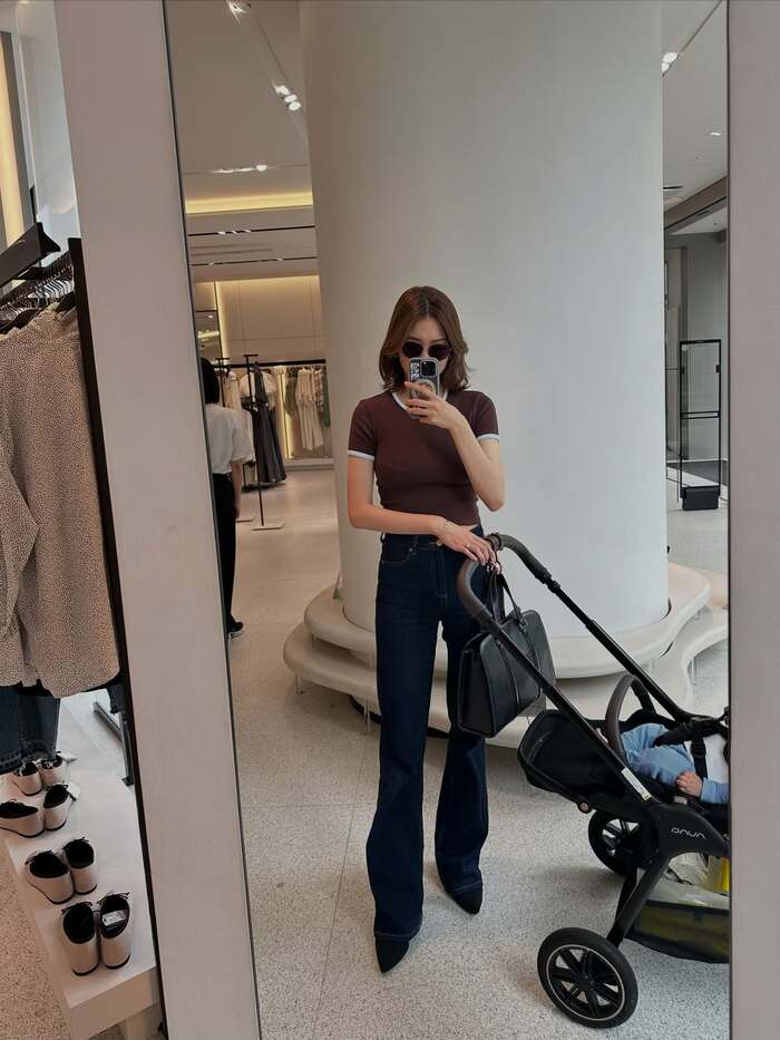 蜂谷さんは、“チビバーグ”が眠るベビーカーのハンドルに手を置き、鏡越しに自撮りをしていて、すらりとしたスタイルに目を奪われます。