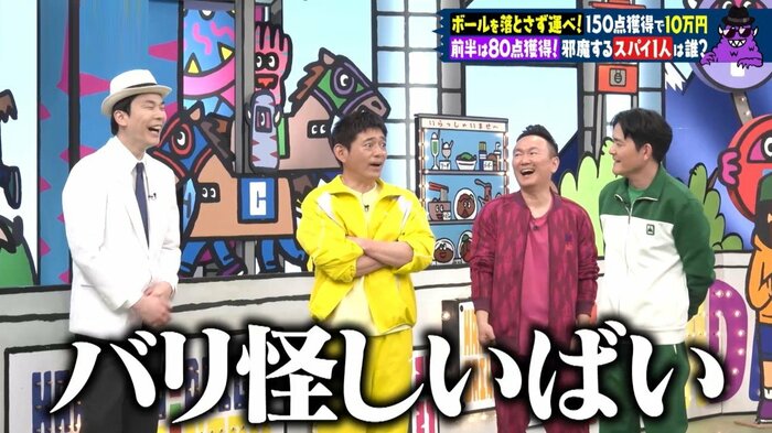 博多華丸さん、博多大吉さん、千鳥(大悟さん、ノブさん)、山内健司(かまいたち)さんを含めた7人のうち1人は、事前にくじ引きで決定した“スパイ”で、ほかのメンバーにバレないようにゲームを失敗させようとします。