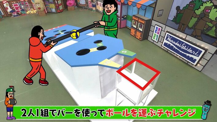 2人1組で両端を持ったバーを使い、ボールを転がしてゴールまで運びます。ポイントゾーン通過で得点、穴に落ちたりコースアウトするとそれまでの点が0に。前半・後半で合計150点獲得で成功です。