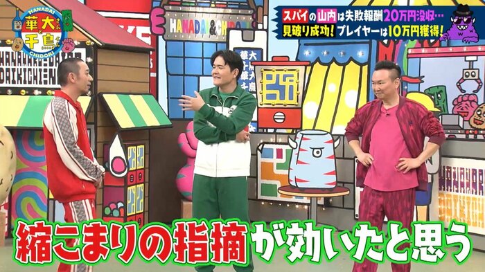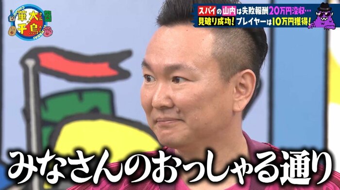 黙る山内さんの横で、華大千鳥メンバーは「縮こまりの指摘が効いたと思う」(ノブ)、「20万円さらっと穫れそうだったから。最近、あまりに嫌われ過ぎてるから『これ獲っちゃダメ』って思ったのかも」(大悟)と言いたい放題。