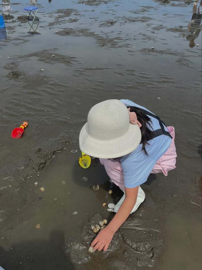 そこには、白い麦わら帽子を被った半袖姿の娘さんが、しゃがみながら貝を探している様子が写し出されています。