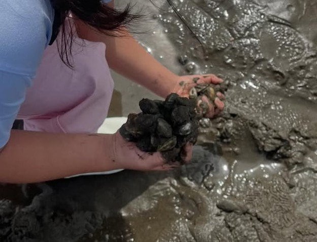 娘さんの両手には、数え切れないほどの貝がたくさん!