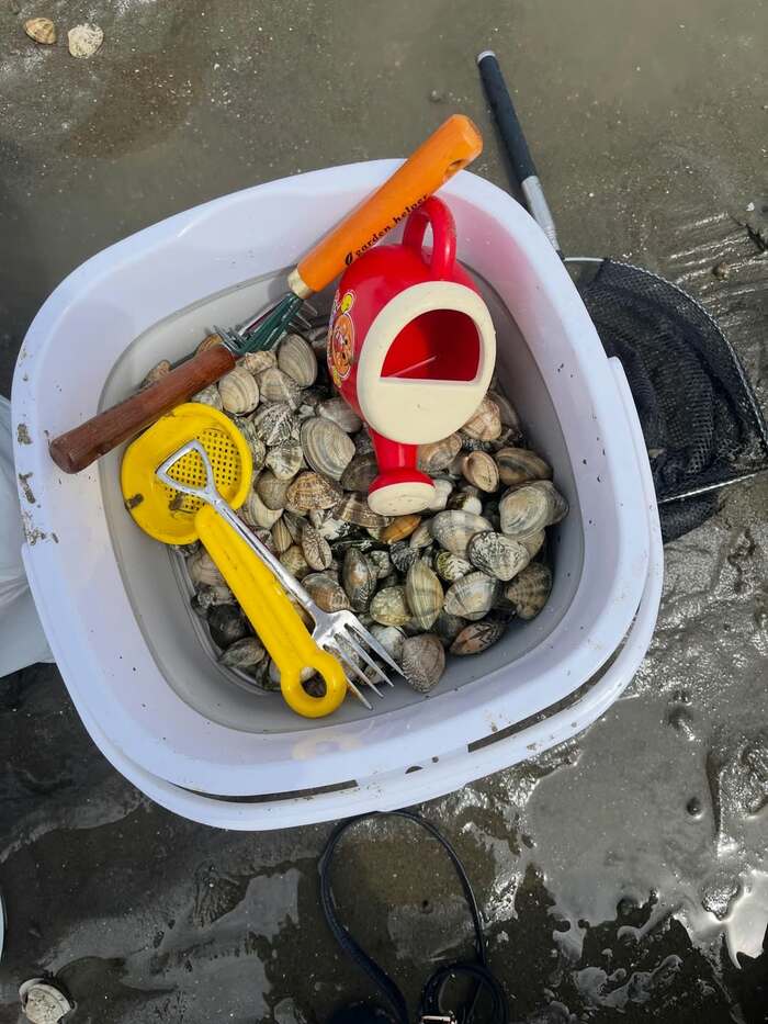 そして、山口さんと娘さんが採ったものでしょうか、バケツには、こんもりと貝が入っています。「ハマグリがとれるって聞いてたけど…アサリが大漁だった笑」と、報告した山口さん。