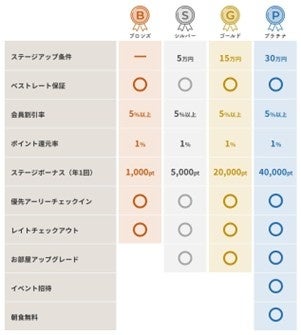 また、すべての会員ステージにおいて優先チェックイン、チェックアウト延長が、シルバーステージ以上では部屋アップグレード(空き室状況次第、保証なし)が可能になるといった特典もあり、特にリピーターのお客様から支持されています。