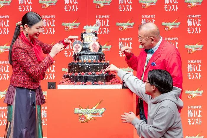 本発表会では10周年を迎えるモンストをお祝いするため、モンスト10周年のコミュニケーションテーマである「イイコトありすぎて怖いよモンスト」の世界観を模した特大の黒いオリジナルケーキが登場。