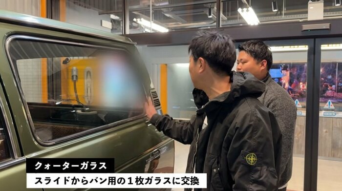 また、後部座席の窓ガラスは元々分かれている部分を尾形さんの要望で1枚ガラスにカスタムしてもらったそうで、「こういうこだわりもあるのよ!レトロな感じに」と尾形さんは熱く語ります。