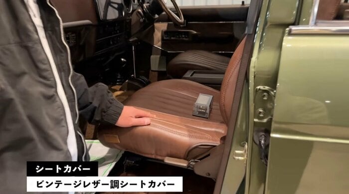 さらに車内を見てみると、シートはブラウンのビンテージレザー調カバーをかぶせており、おしゃれな雰囲気に。気分によってはカバーを剥がして、元のシートで乗ることもできるといいます。