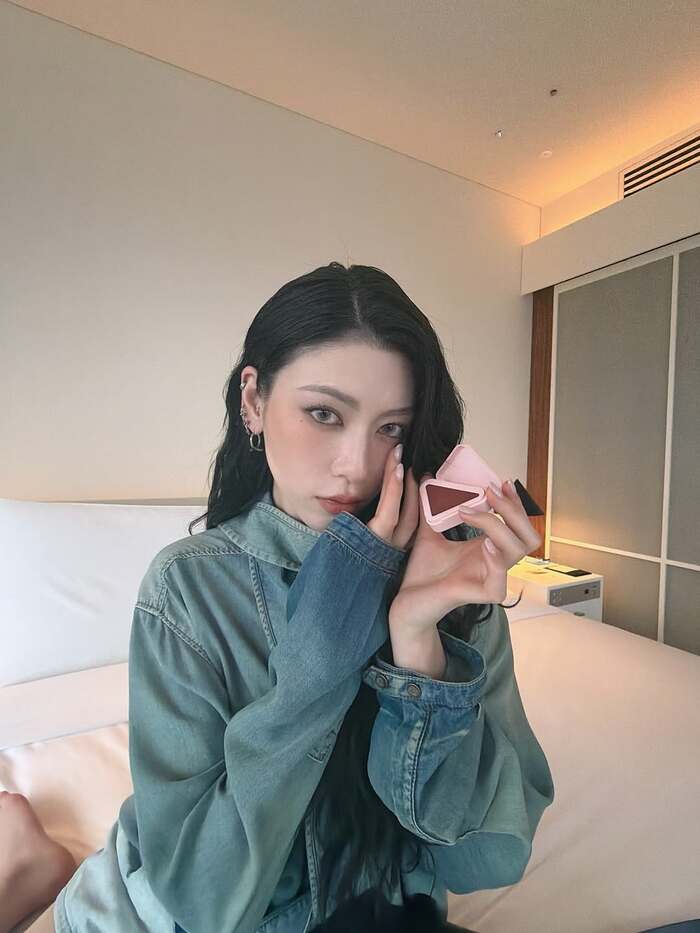 さらに、手にしたピンクのコスメケースを顔の近くに寄せたカットも。