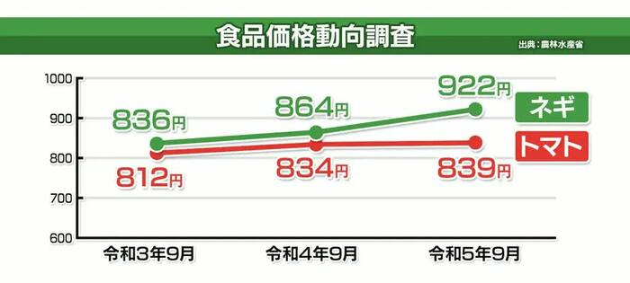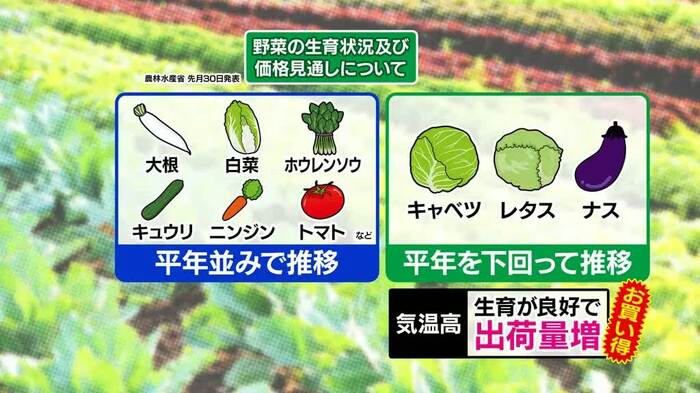 ネギやトマトは令和3年から価格が上がる一方ですが、農林水産省によると大根などは今後平年並みの価格で推移し、キャベツやレタスは安くなるという見通しだといいます。