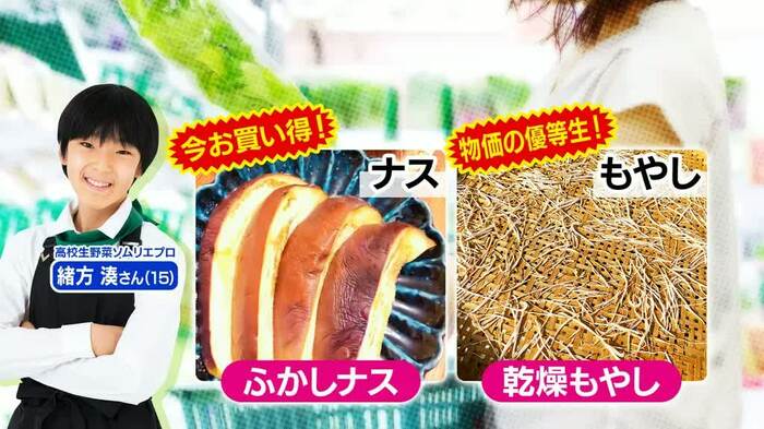 野菜ソムリエの緒方さんは、価格が安いナスを使った「ふかしナス」や、価格の優等生のモヤシを「乾燥モヤシ」にして保存するという方法を紹介しました。