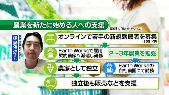 また、農業法人「Earth Works」では、農業に興味のある人をオンラインで募集し、契約農家に派遣。そこで農業を修行したあと、農家として独立した場合はその後の支援まで行っているといいます。